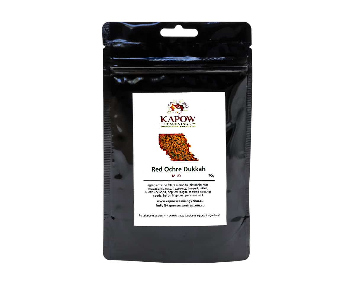 Dukkah “Red Ochre” is blended and packed in Australia using local and imported ingredients.